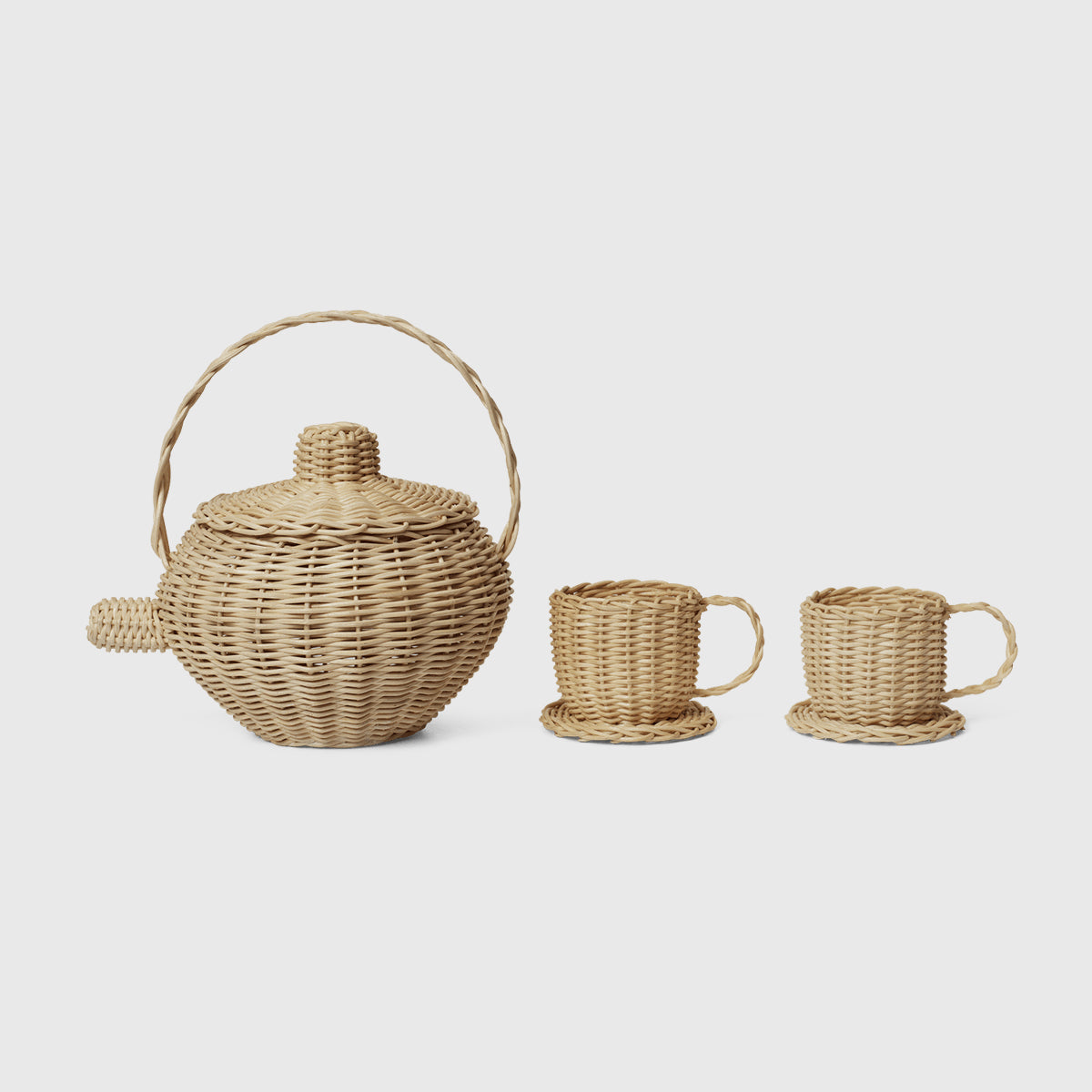 The Rattan Tea Set is a delightful addition to any child's playtime repertoire and the perfect accessory for an enchanting kids play date. This charming set includes two cups and a teapot, all handcrafted from natural rattan. Designed to inspire imaginative play, the Rattan Tea Set is perfect for hosting a stuffed animal gathering or serving a parent a pretend cup of tea.