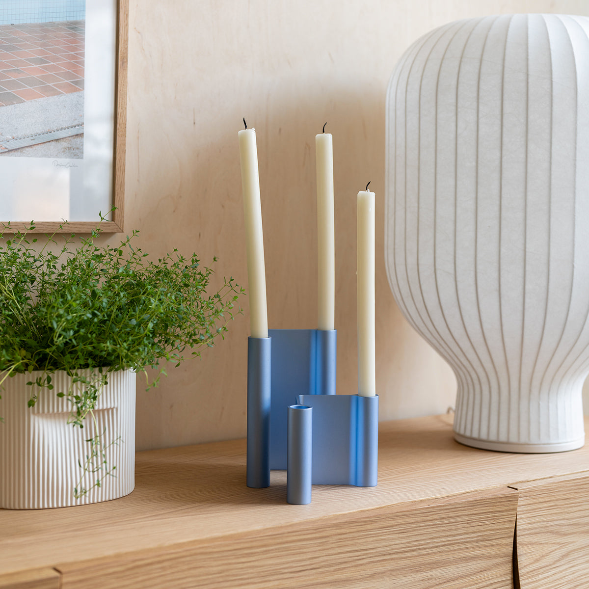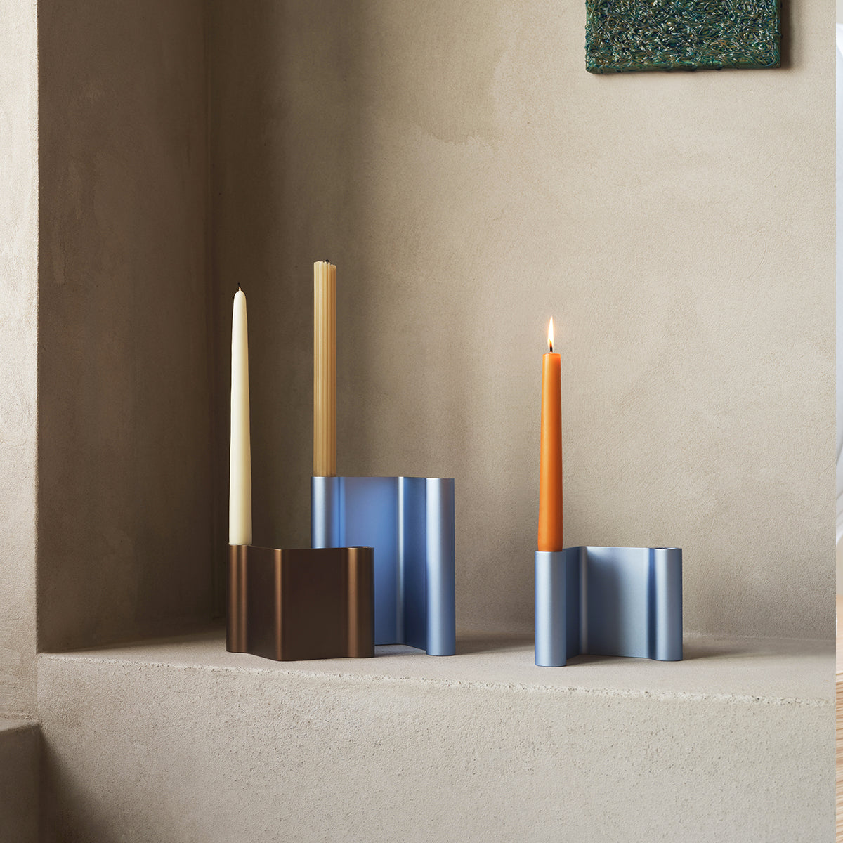 The Pair Candleholder invites creativity, offering the opportunity to combine two or more pieces and explore various height and colour combinations or display a single piece as a refined accent on its own. Crafted from anodised aluminium, its smooth curves and finish add a playful yet refined touch to any space.
