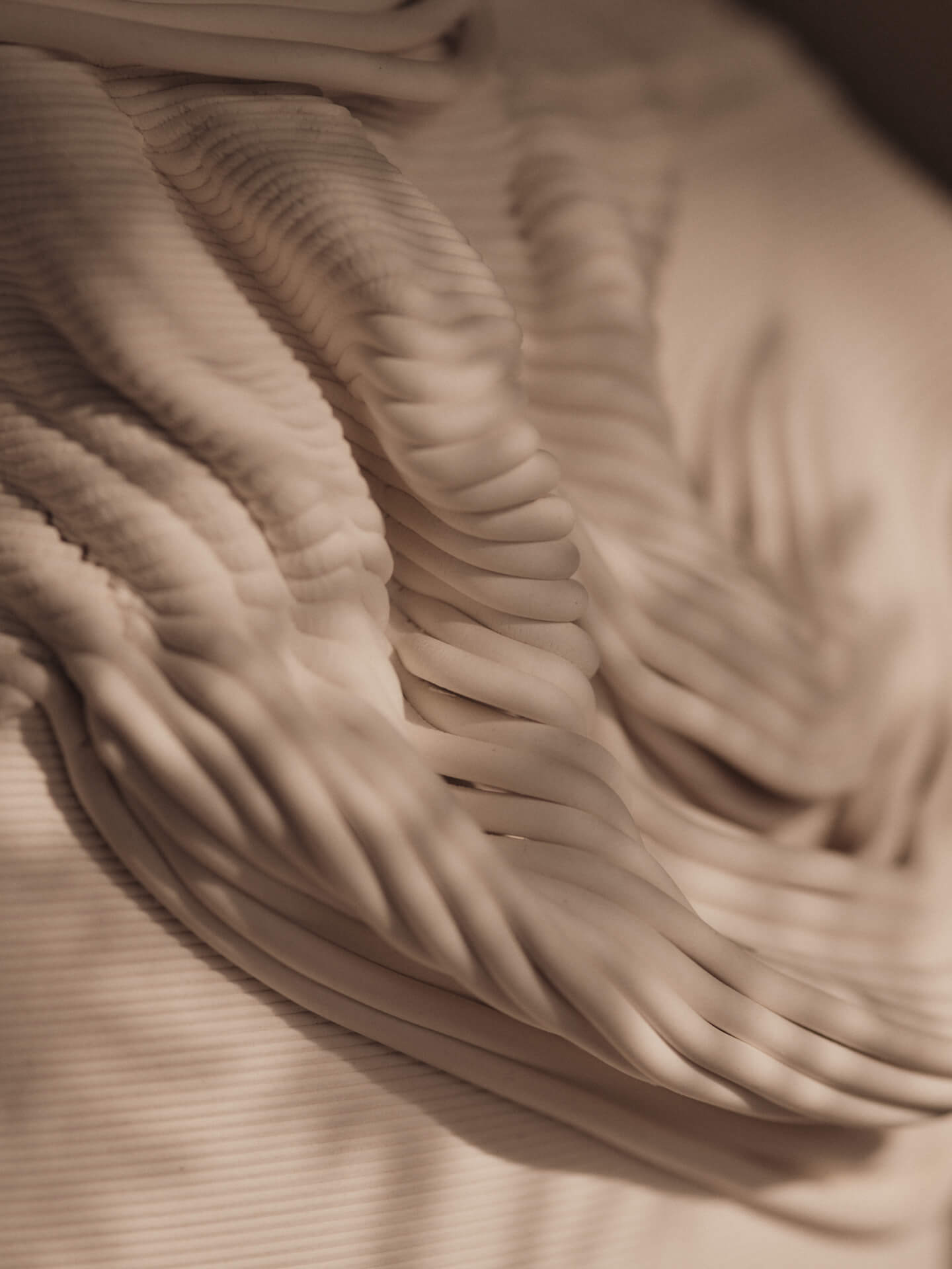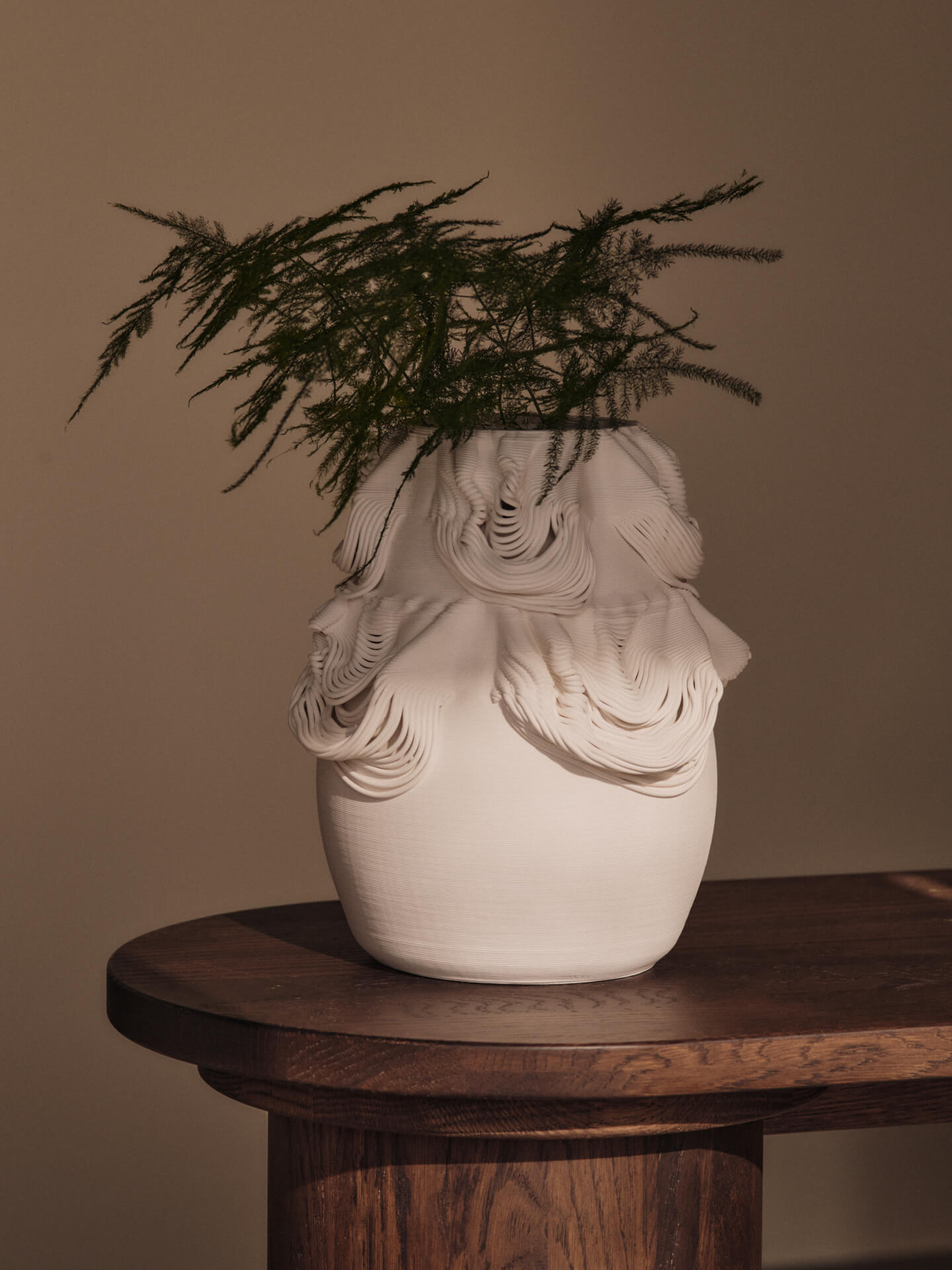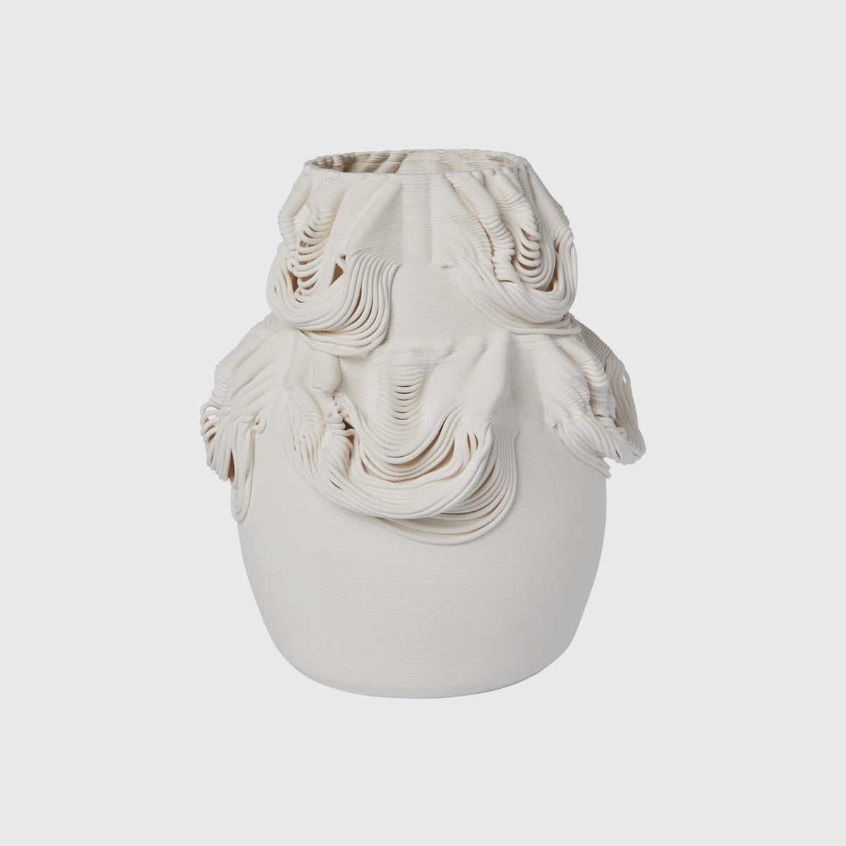 The Drisca Vase combines a traditional silhouette with 3D-printed ceramic, showcasing innovative craftsmanship. Its unglazed, matte surface highlights the tactile quality of the material, while ribbon-like patterns evoke the flow of fabric. Suitable for dried flowers or as a standalone display, it brings sculptural presence to shelves, consoles or pedestals.