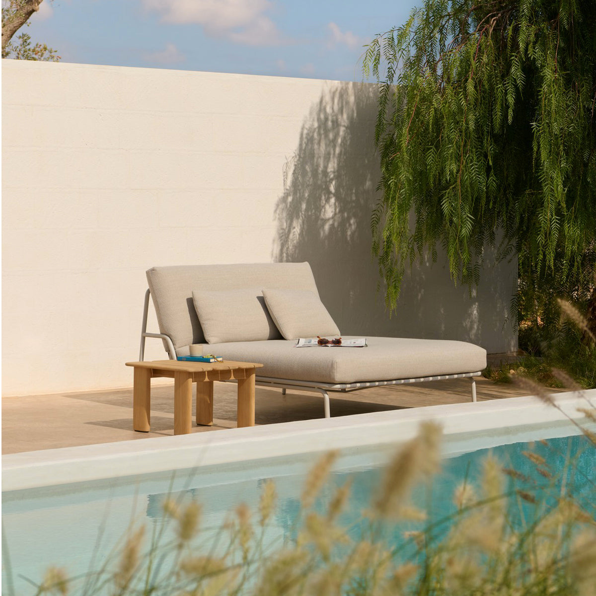 The Settle Lounge Bed w. Armrest invites you to settle into its comfort. With its deep, leaned backrest and extra cushion for added comfort, it's ideal for long, leisurely hours spent unwinding outdoors. Its airy steel frame, complete with visible belts and intricate details, enhances its visual allure from all angles, while its armrests, made from FSC™-certified (FSC-C028824) sapele mahogany wood, add a warm, tactile feel. Settle's steel frame is galvanized, primed, and powdercoated, ensuring corrosion resistance for long-lasting use. The plush cushions, made with quick-dry foam and durable outdoor textiles, offer fast-drying resilience in rain showers and year-round durability when used with an outdoor cover.