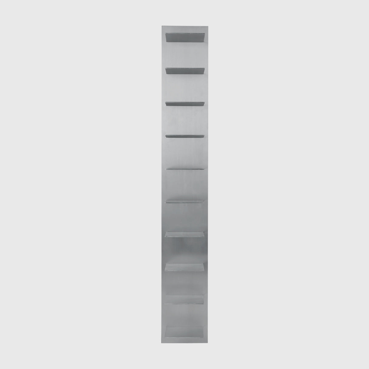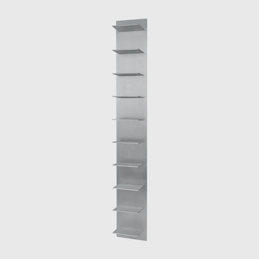 The Lager Wall Shelf in its tall vertical format offers a clean and considered approach to wall-mounted storage. Crafted from brushed aluminium with subtle industrial cues, it offers a sleek and elongated storage solution, perfect for books and other objects. The shelf can be easily stacked with other shelves to create a cohesive display.