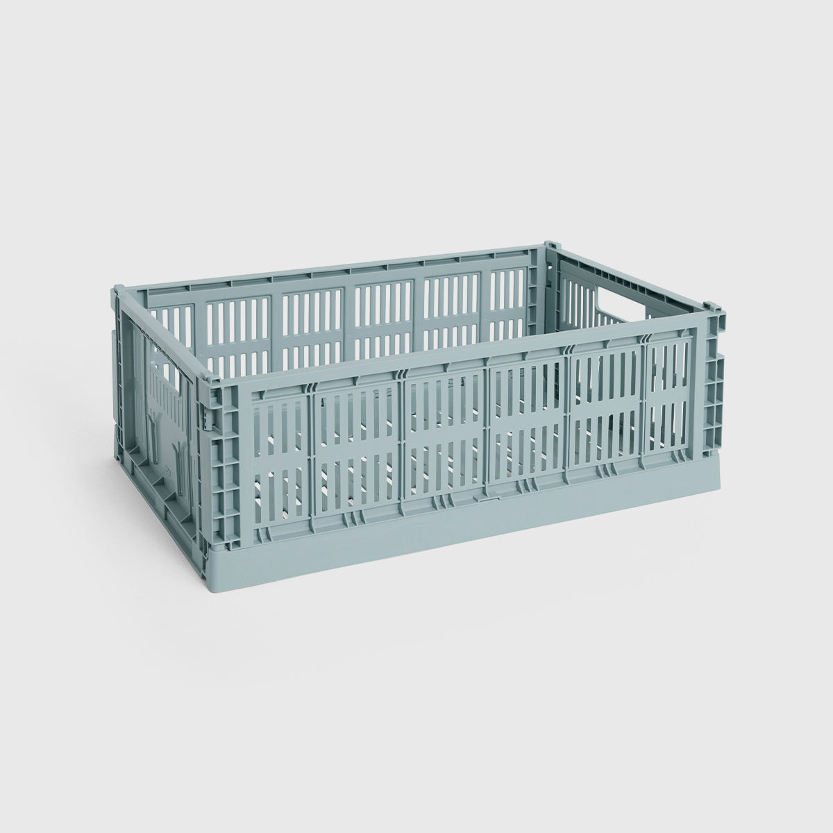HAY Colour Crate is a series of colourful storage boxes with a distinctive, perforated design. Made from 100% recycled post-consumer plastic waste in a variety of different colours and sizes, the crates can be stacked on top of one another in different size combinations. The multifunctional crates are suitable for storing and organising a wide range of items on shelves, tables or inside cupboards.