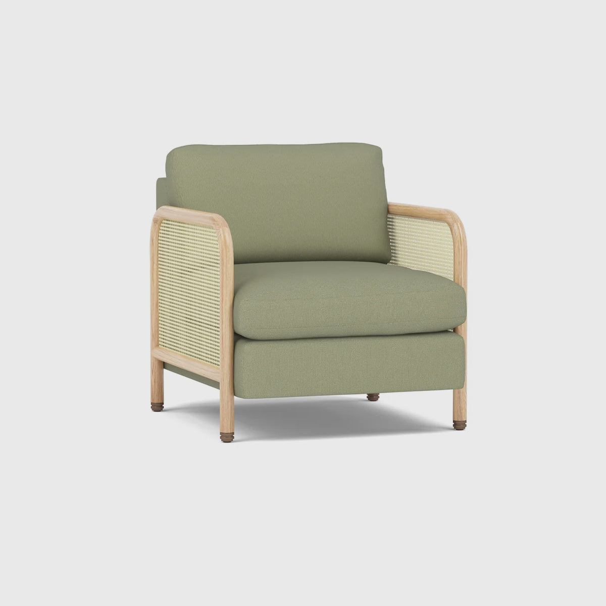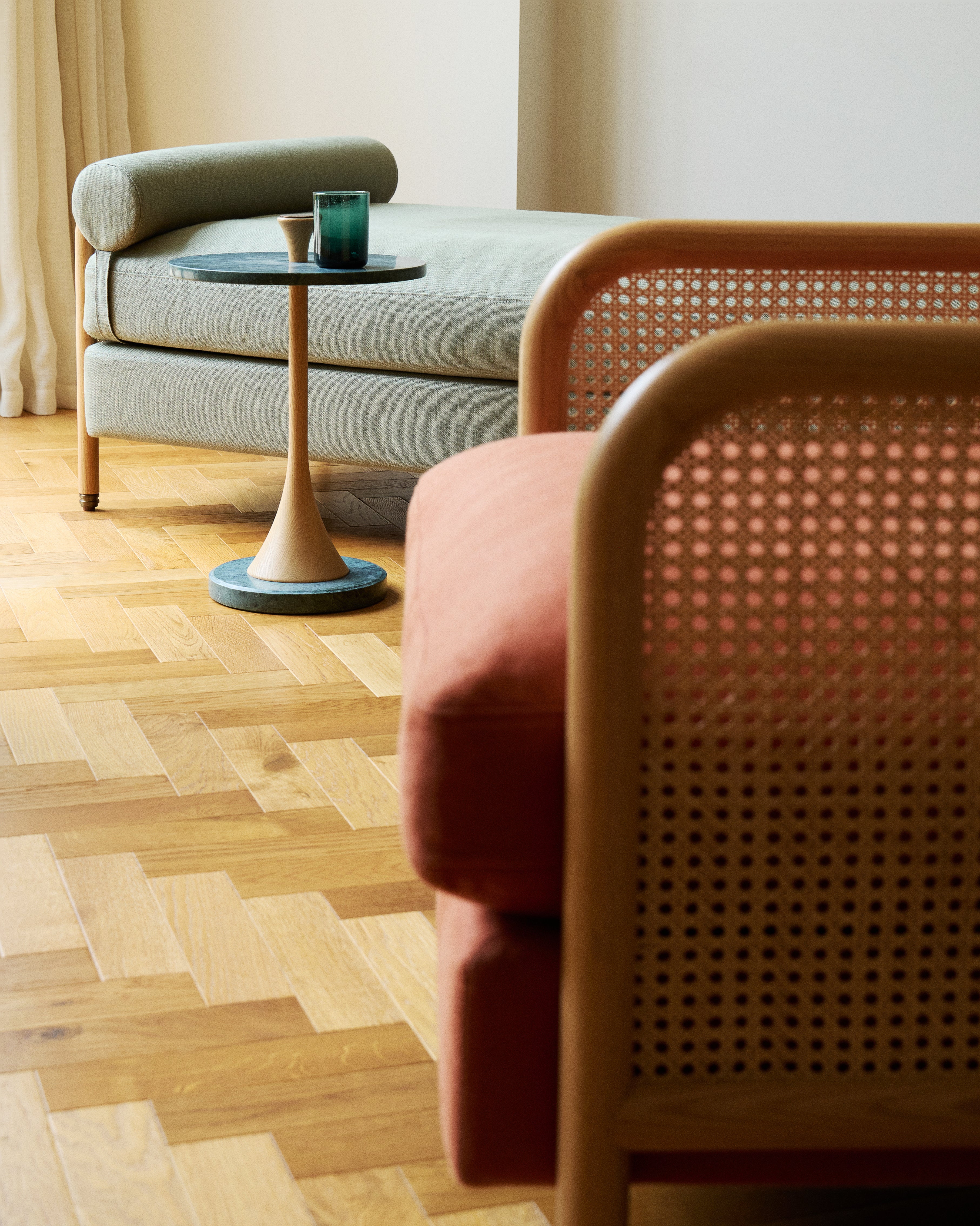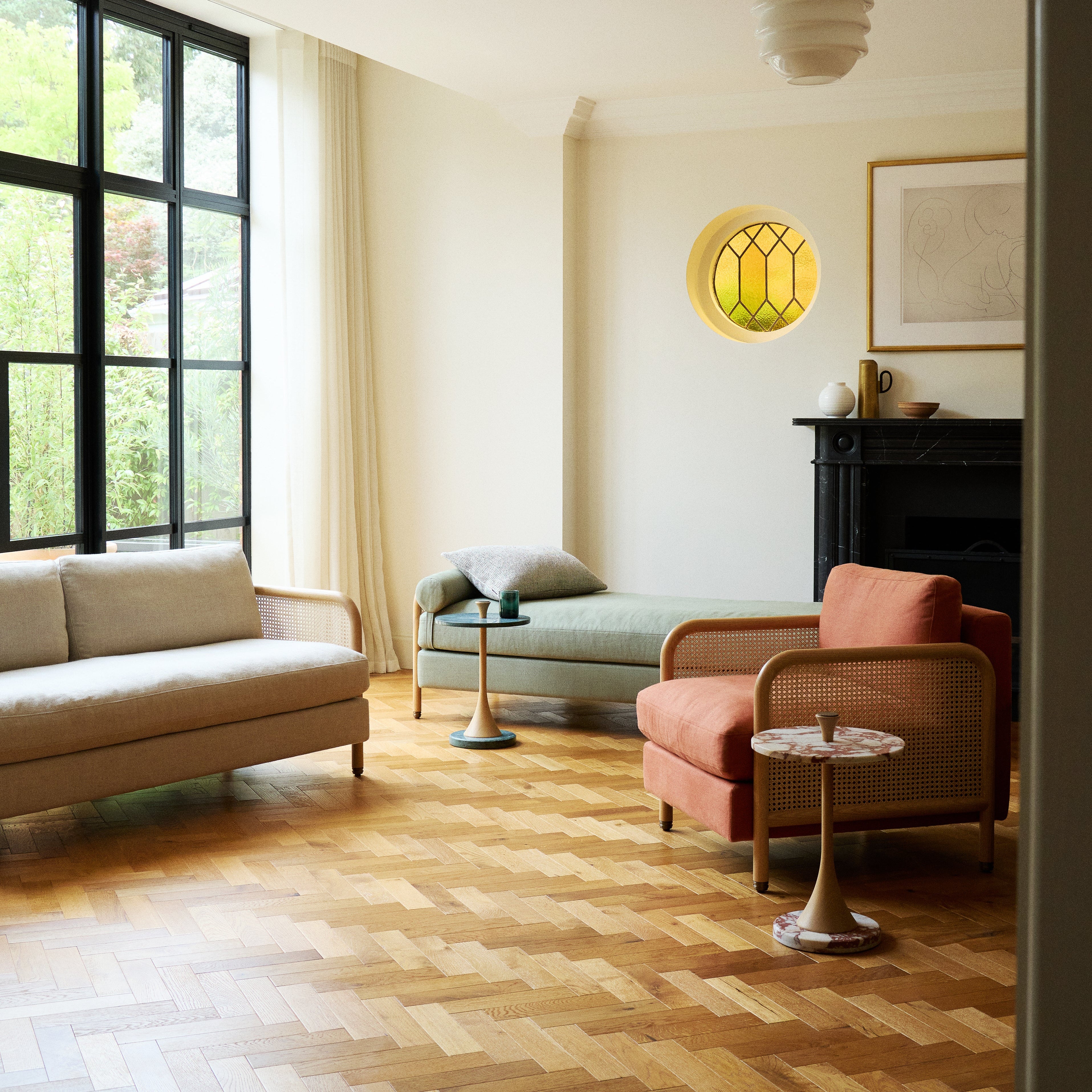 The Tamilla collection includes an armchair, daybed, and two-seater sofa, each crafted with solid oak frames, rattan side panels, and Belgian linen upholstery in Oatmeal, Sage, or Dahlia. Two marble side tables complete the range, made from natural, untreated honed marble, offered with a Verde Marl or Bulgari Red top and base.
